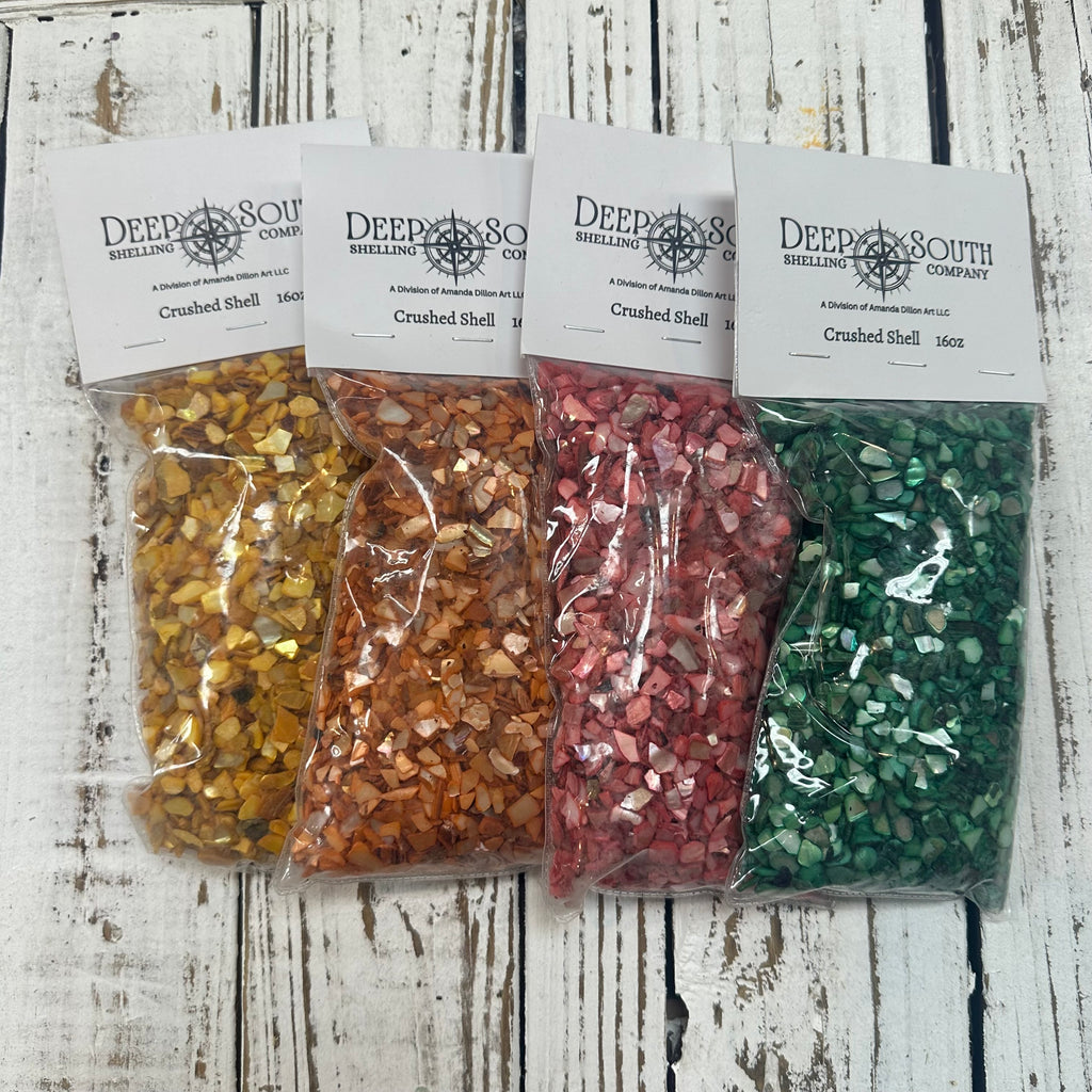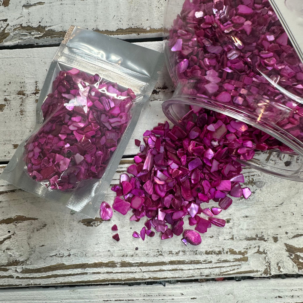 Vibrant crushed shell for crafting. Perfect for resin crafts. Two sizes and numerous color options available.