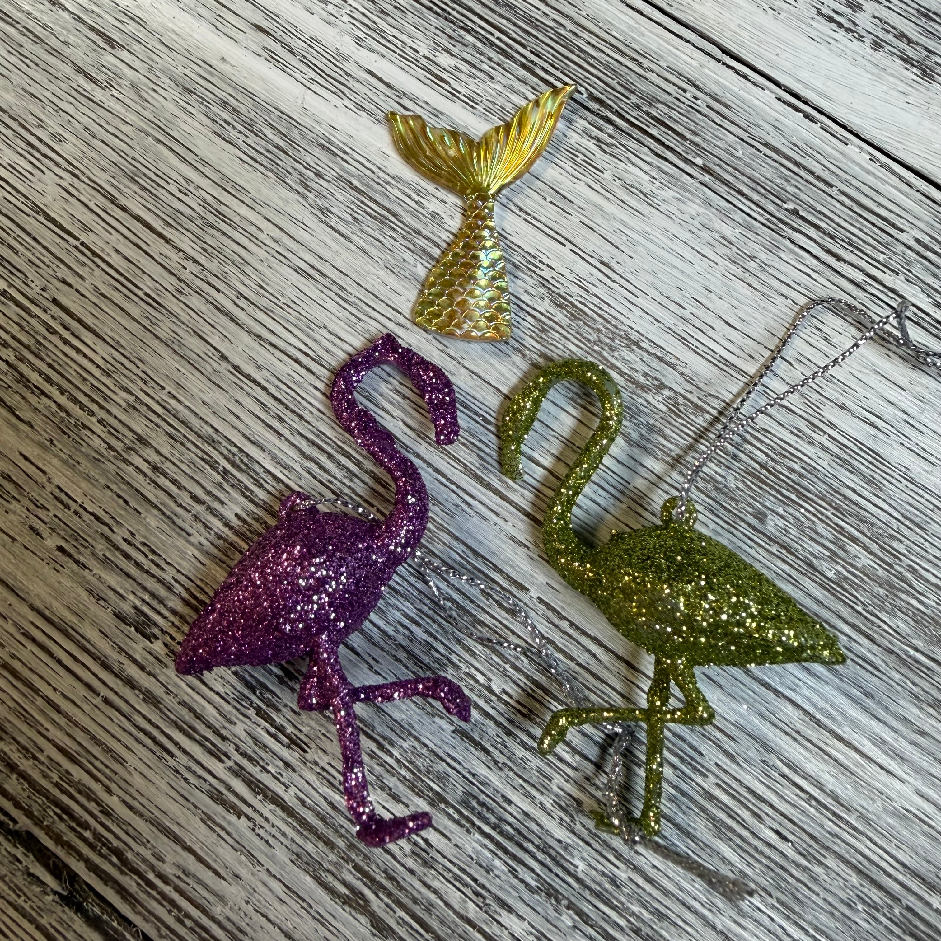 Two flamingos and a mermaid tail to complete your glass tree. Pair with reflective glass!