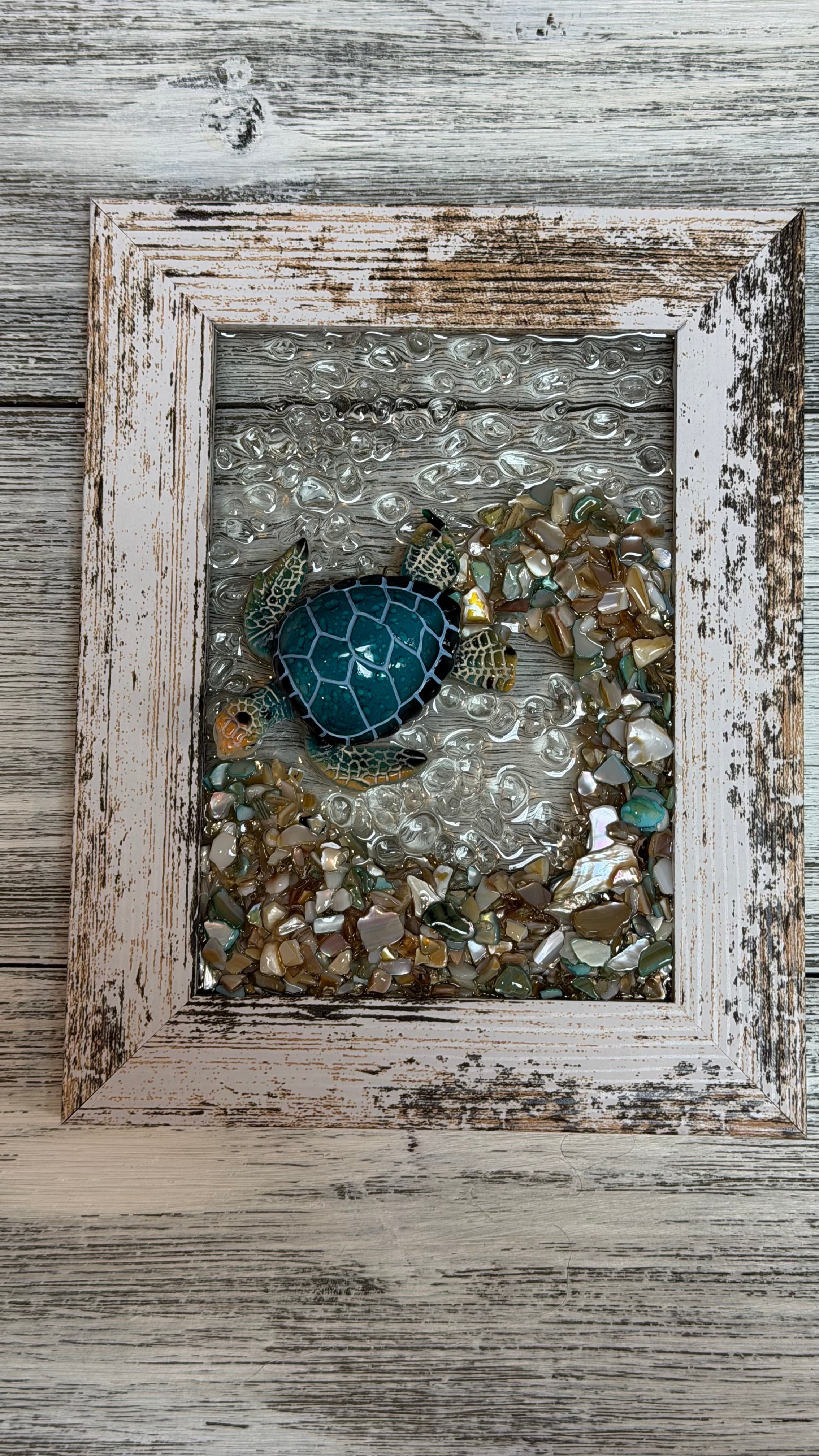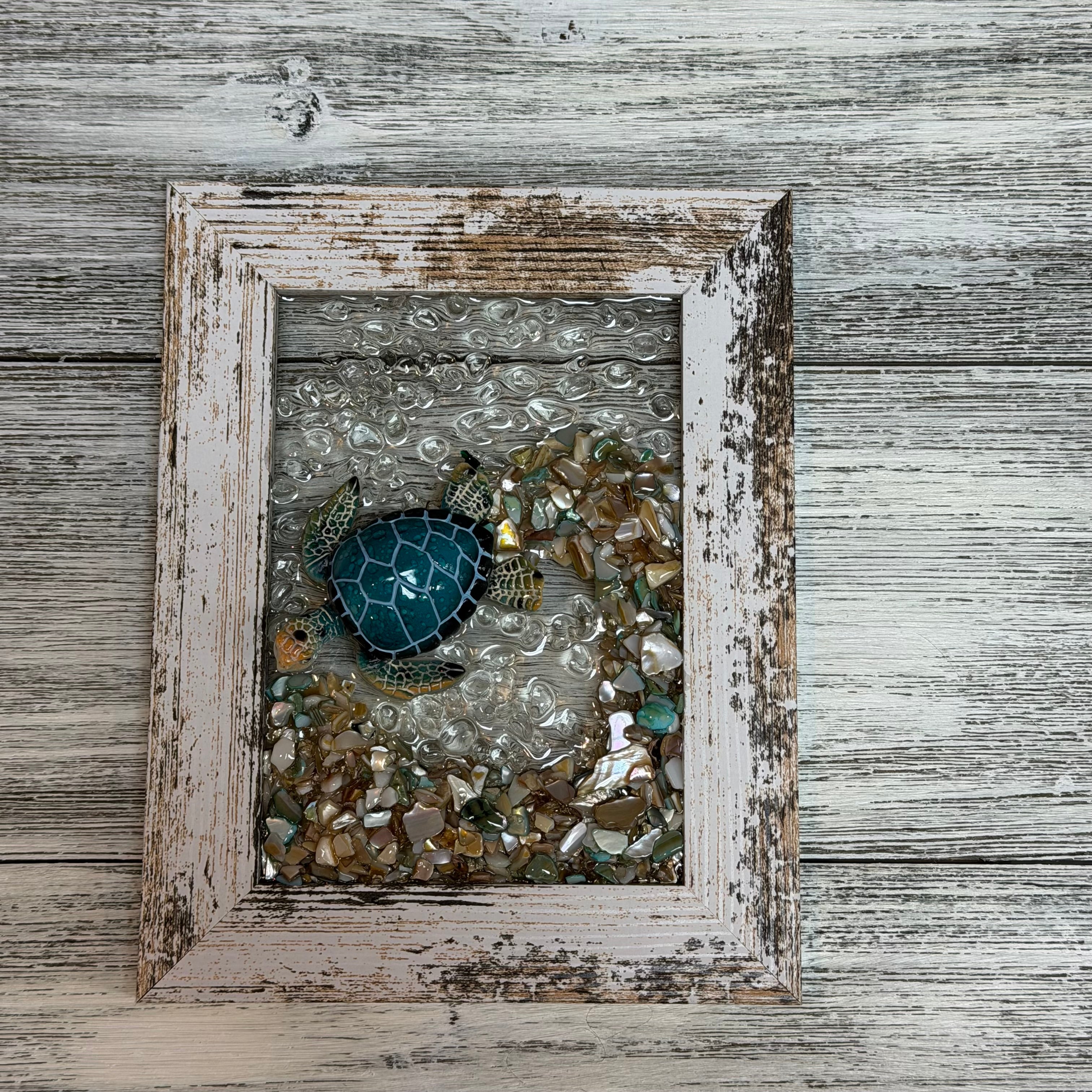 Create your own aqua turtle glass art with our 5x7 kit. Kit includes 5x7 weathered frame, aqua turtle, crushed shell mix, and crushed glass. The kit includes 2oz ArtResin brand resin.