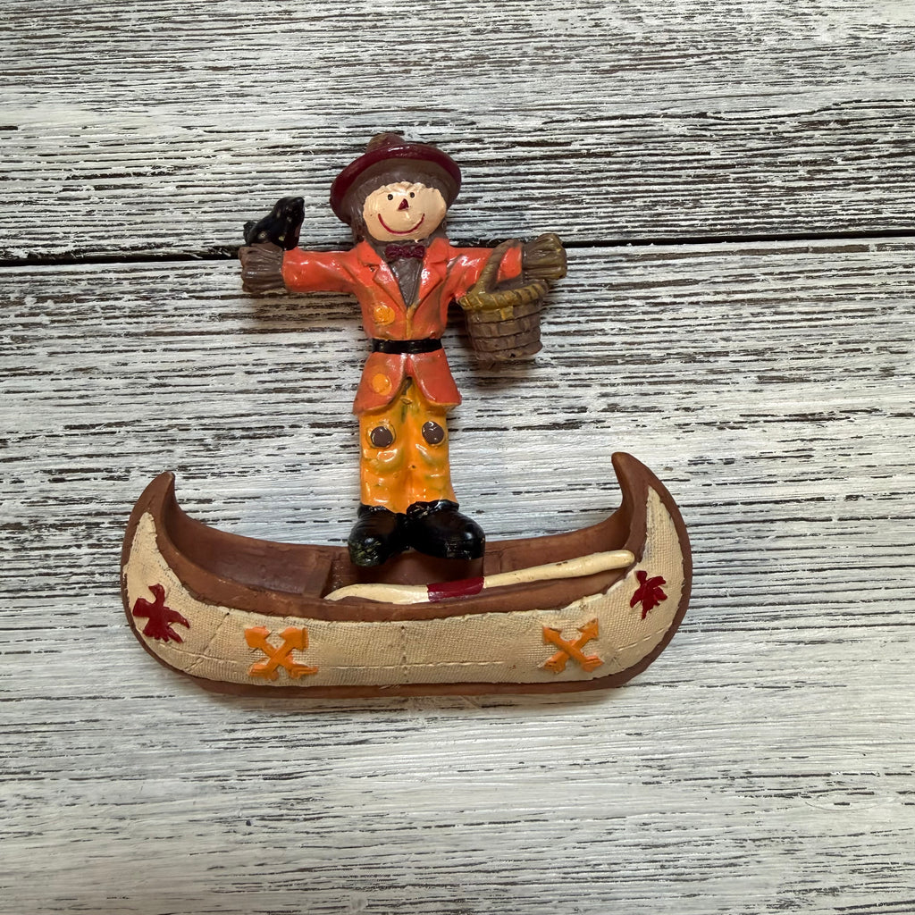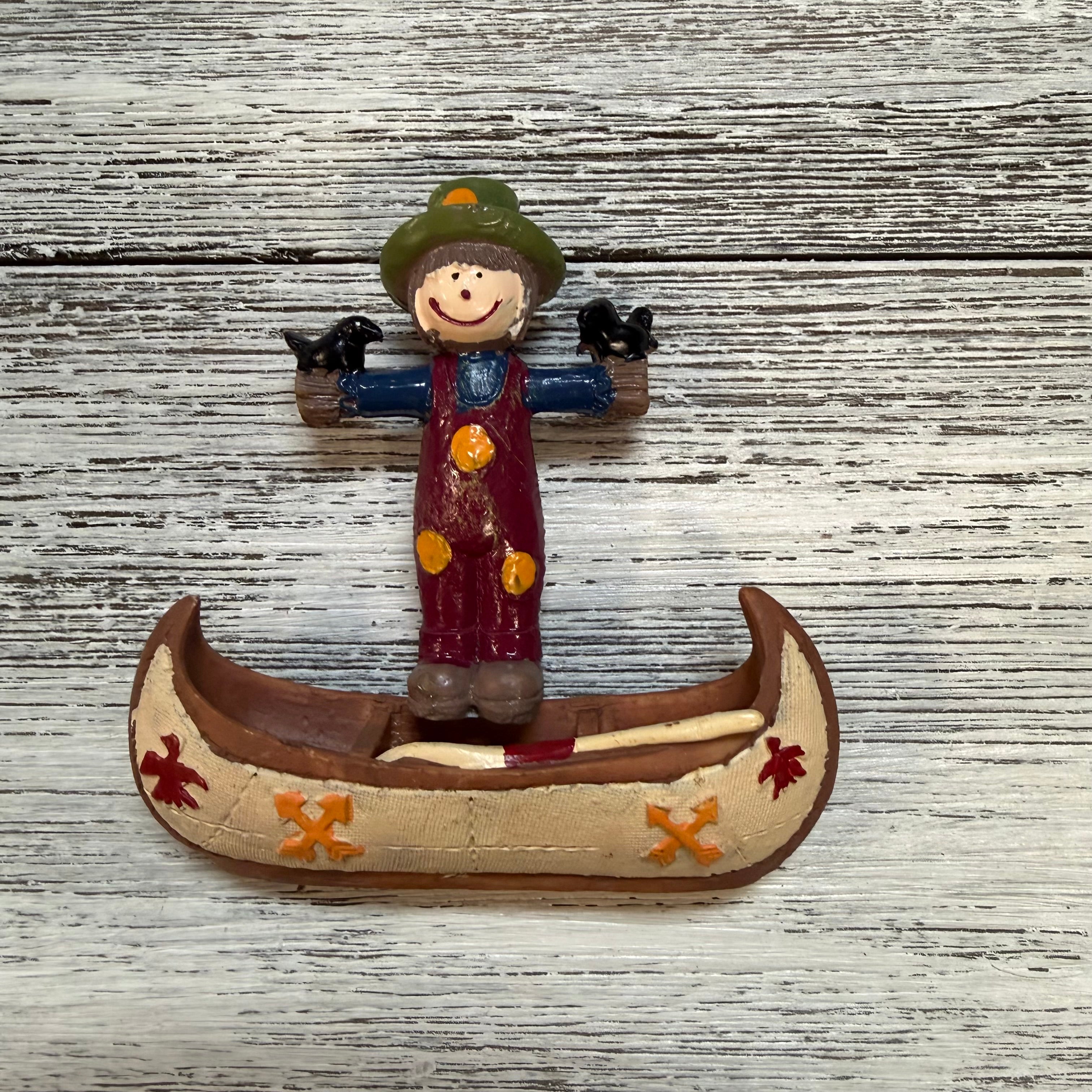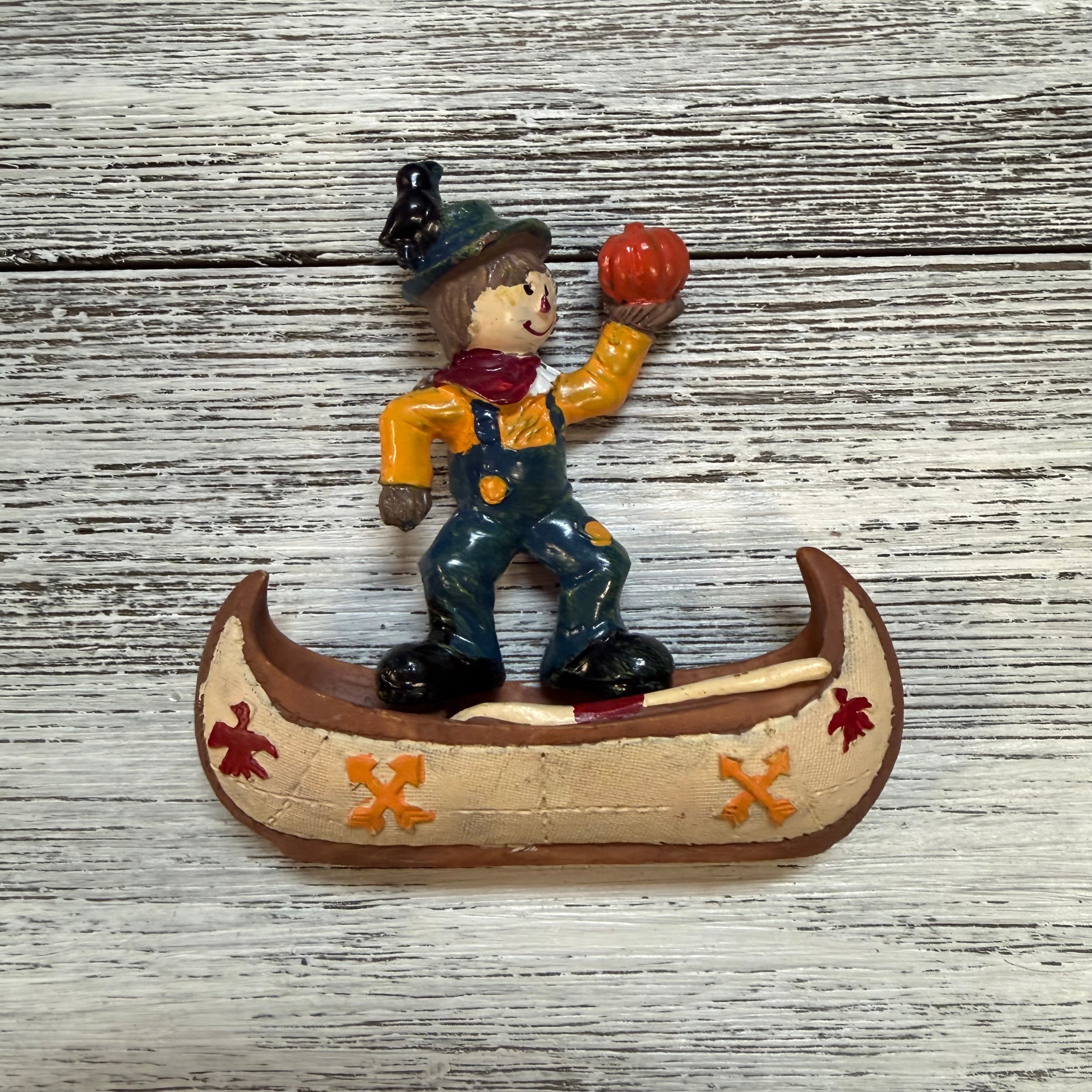 Harvest Canoe Thanksgiving Special. Choose from yellow, red, or blue scarecrow paired with a canoe! Set contains two pieces: canoe and scarecrow of your color choice. Polyresin.