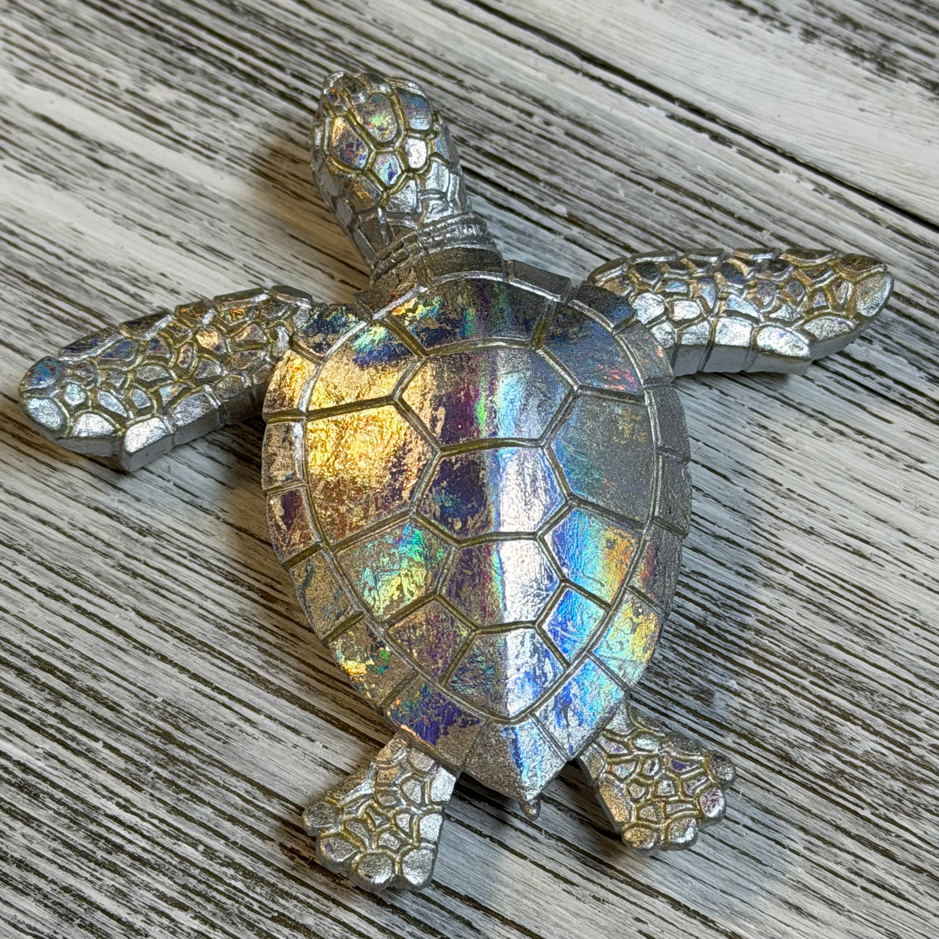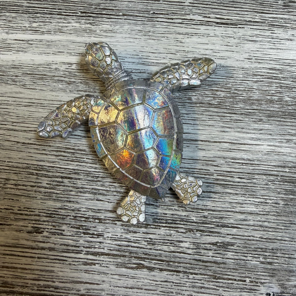 This Silver Creamy Turtle Magnet measures 3.5” and is polystone composite. The silver reflectivity will reflect colors around it.