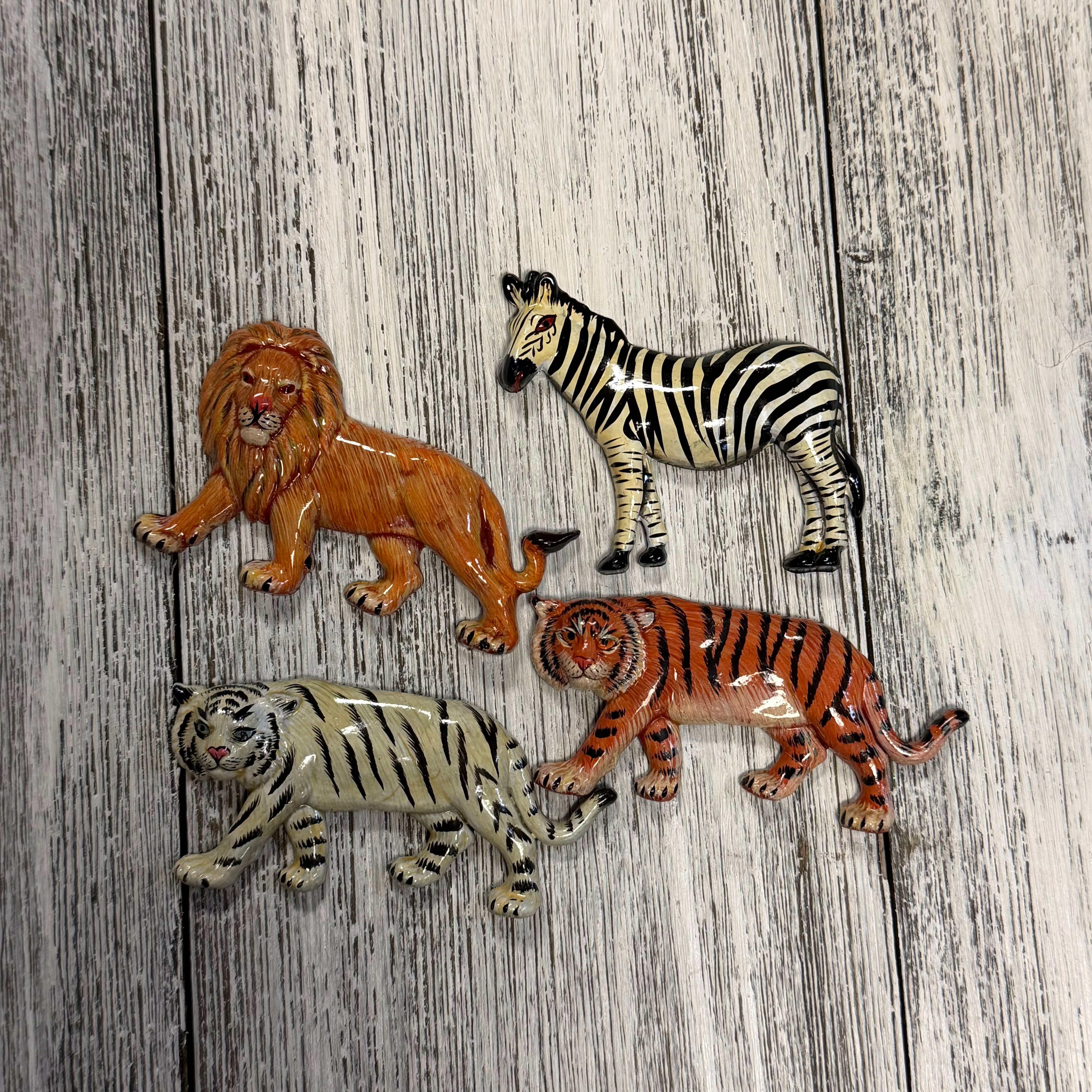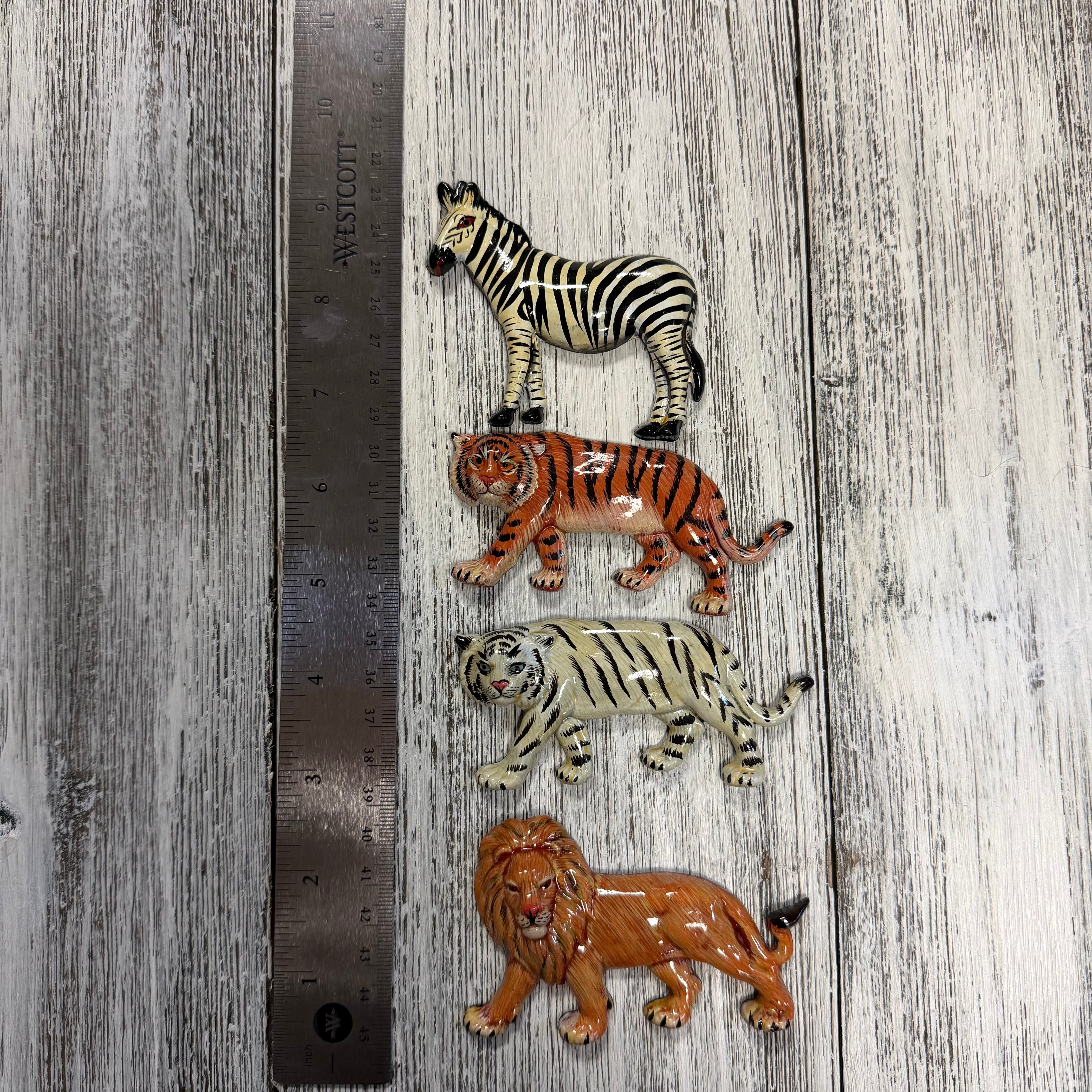 Two Tigers, Lion, Zebra magnets measuring approximately 3-3.5”. High quality hand painted acrylic resin composition. 4 total magnets. Perfect for glass and resin art design.