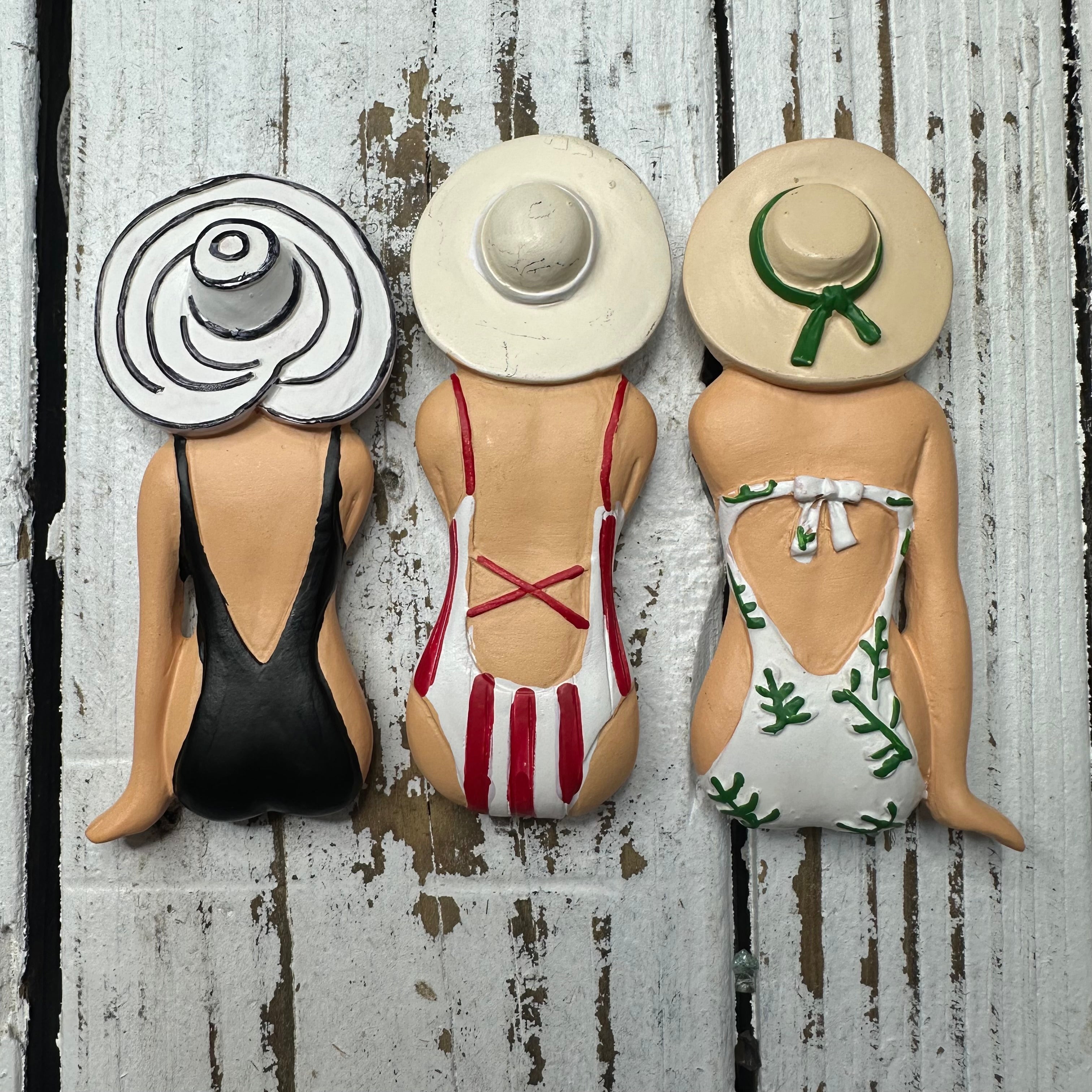 Beautiful trio of swimsuit lady magnets. Each girl measures approximately 3.5”. Polyresin composite. Set of 3: one each red, black, and green.