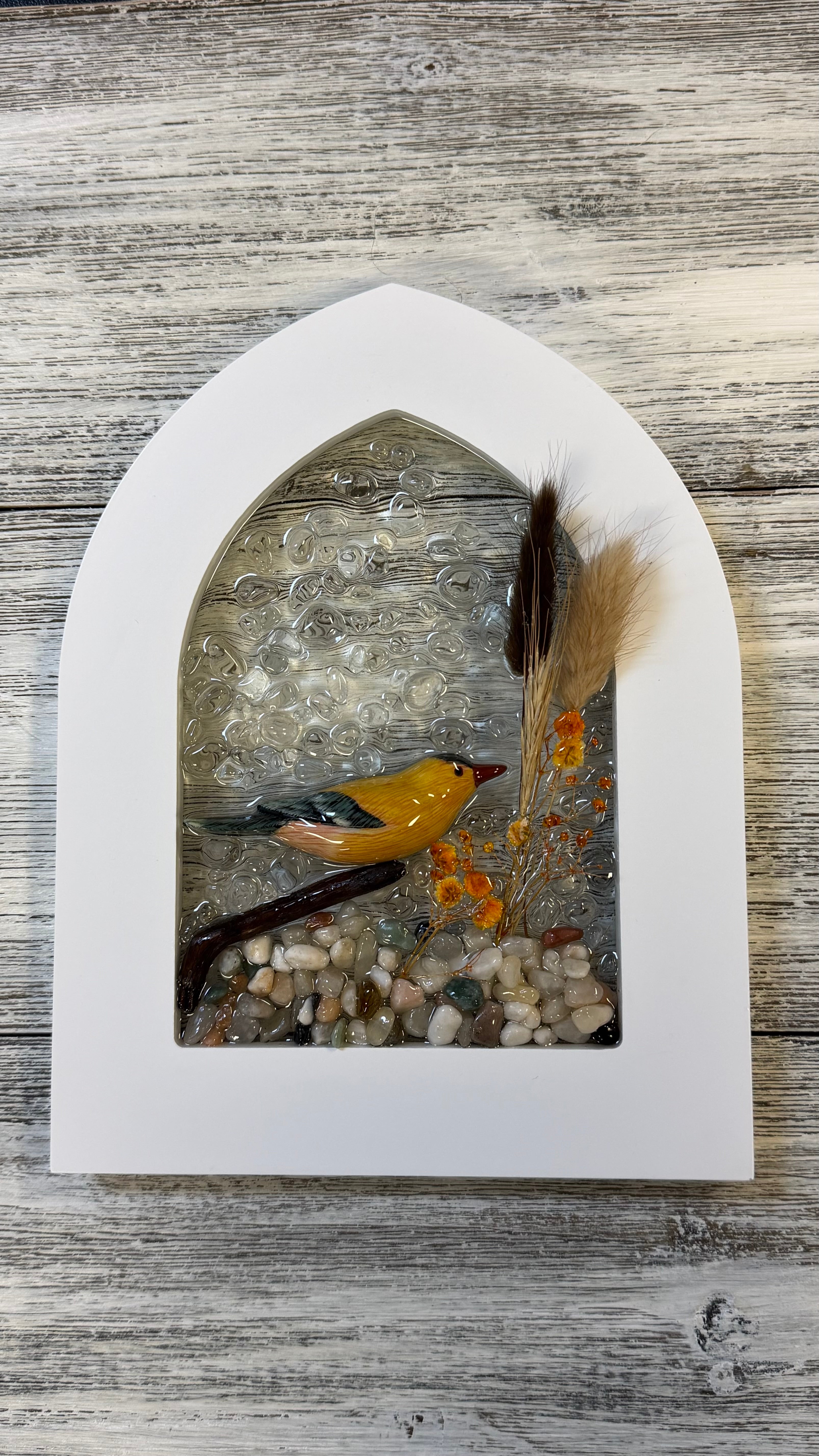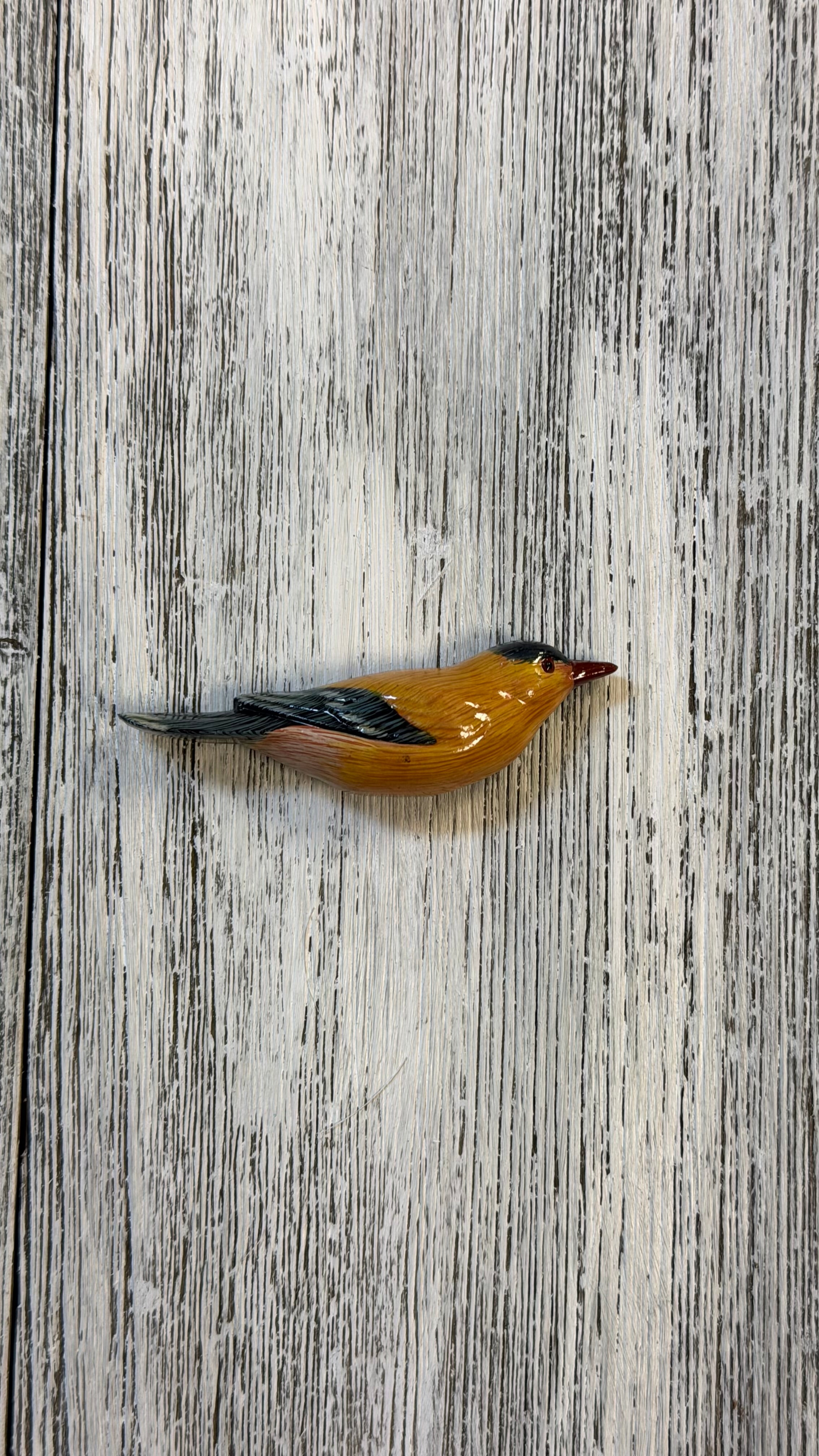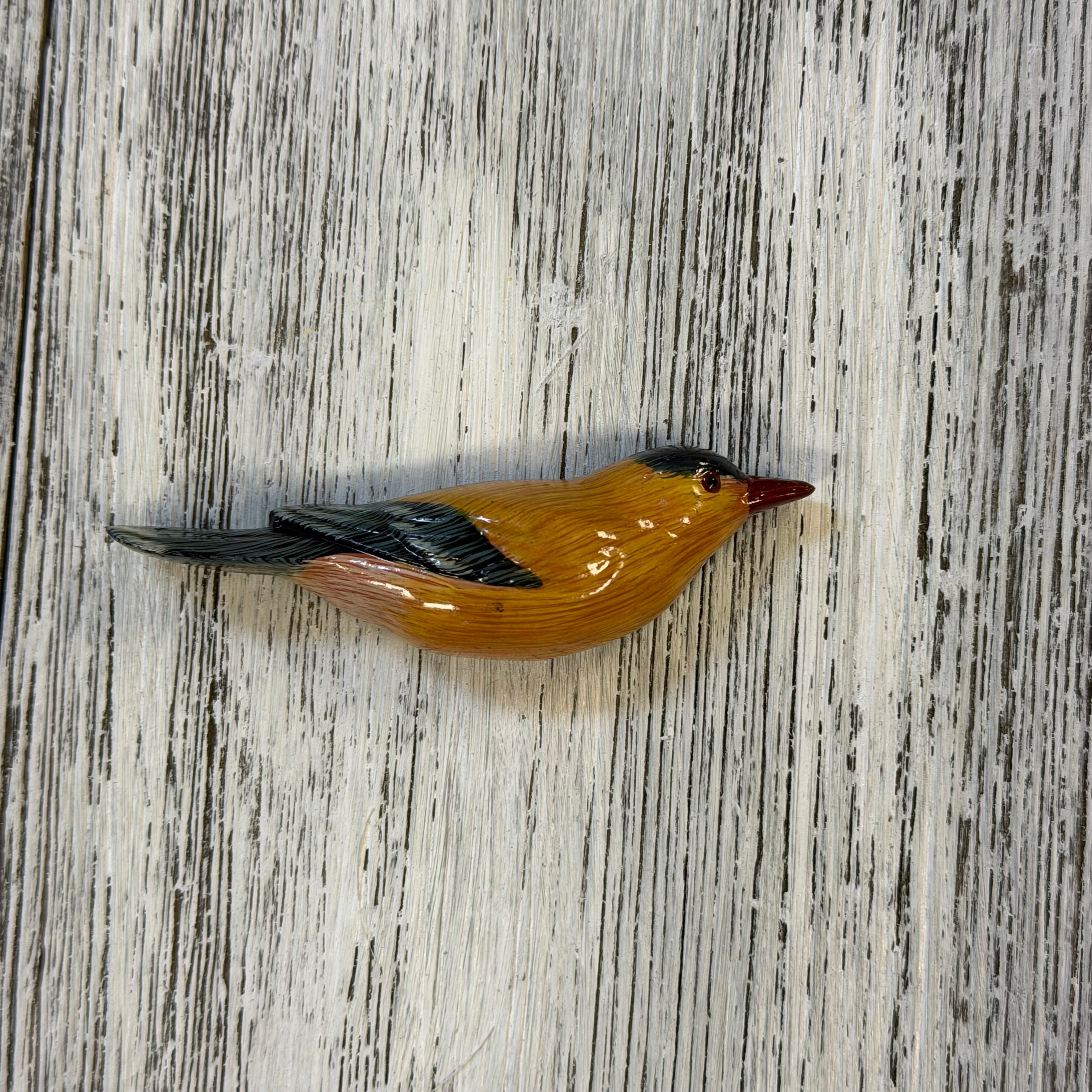 Gold Finch Acrylic Bird Magnet for our Birdwatching Collection. 3” long. 3D, acrylic magnet. pairs beautifully with arched frames for your glass art collections.