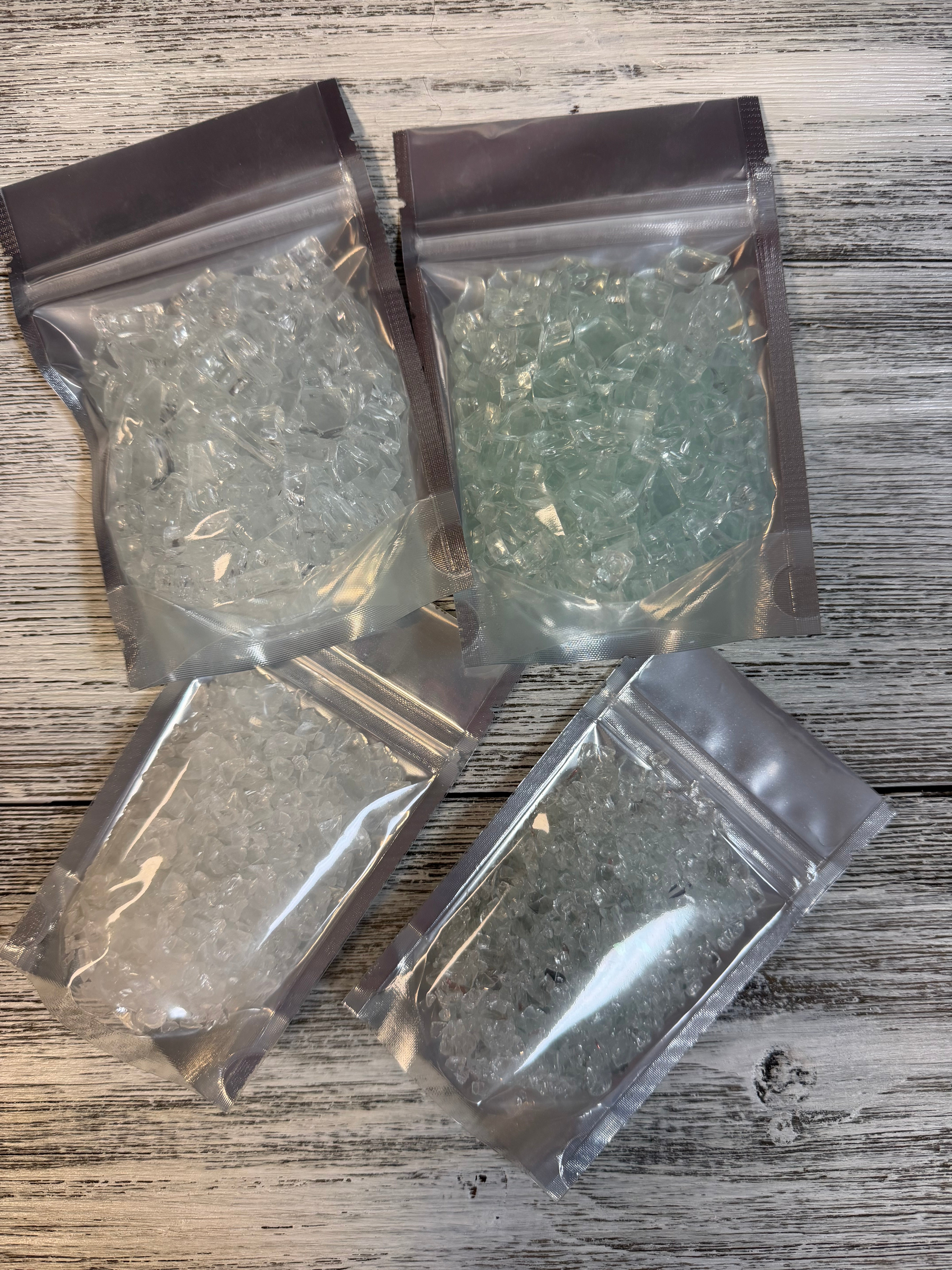 Our most used Glasses! This sampler includes 7oz each of 1/4" starlight ultra clear, 1/4" clear ice, 3oz of clear confetti art glass 3-6mm, and 3 oz of ultra clear art glass 3-6mm. Create stunning art with this collection of neautrals! Use caution when handling glass products as glass can cut or irritate.