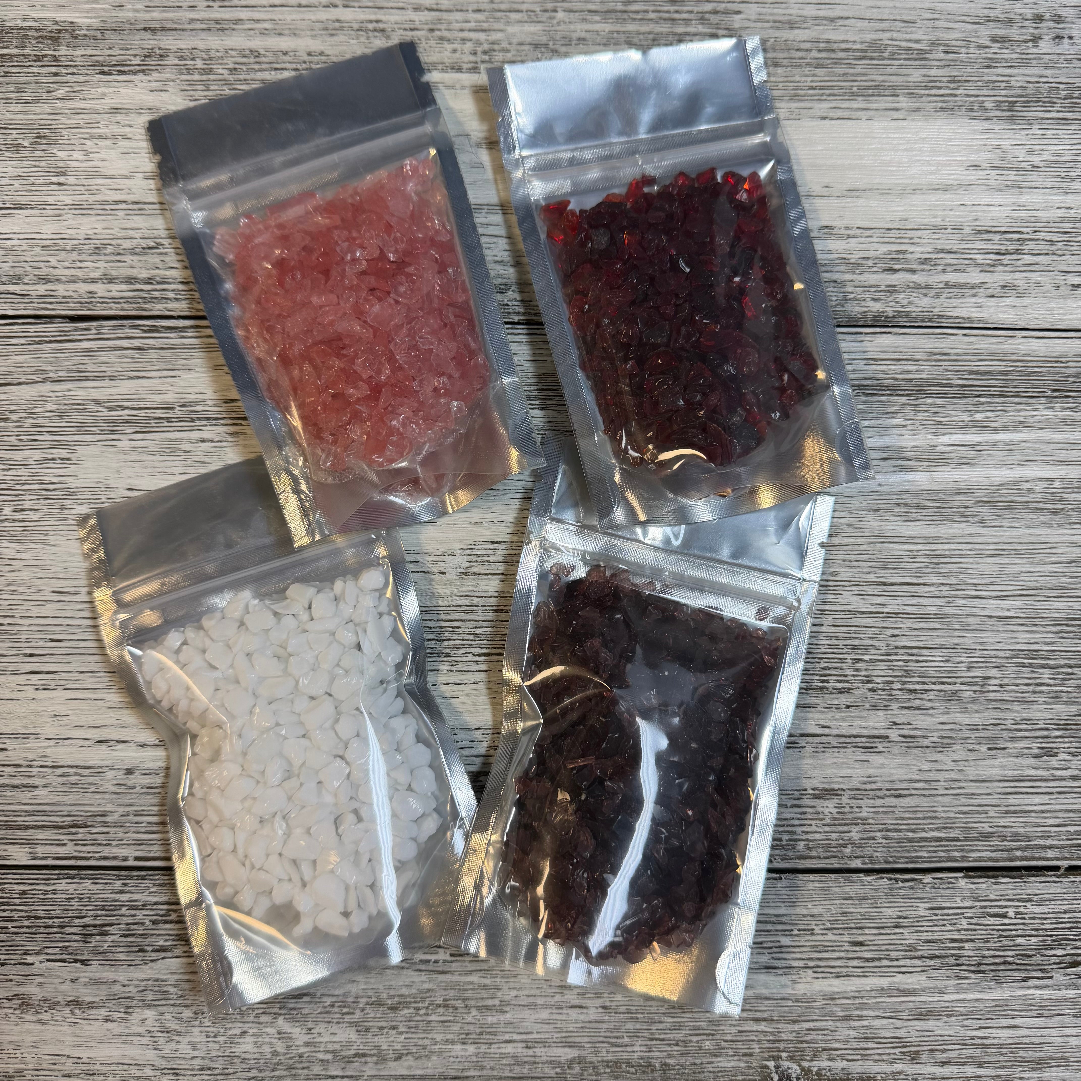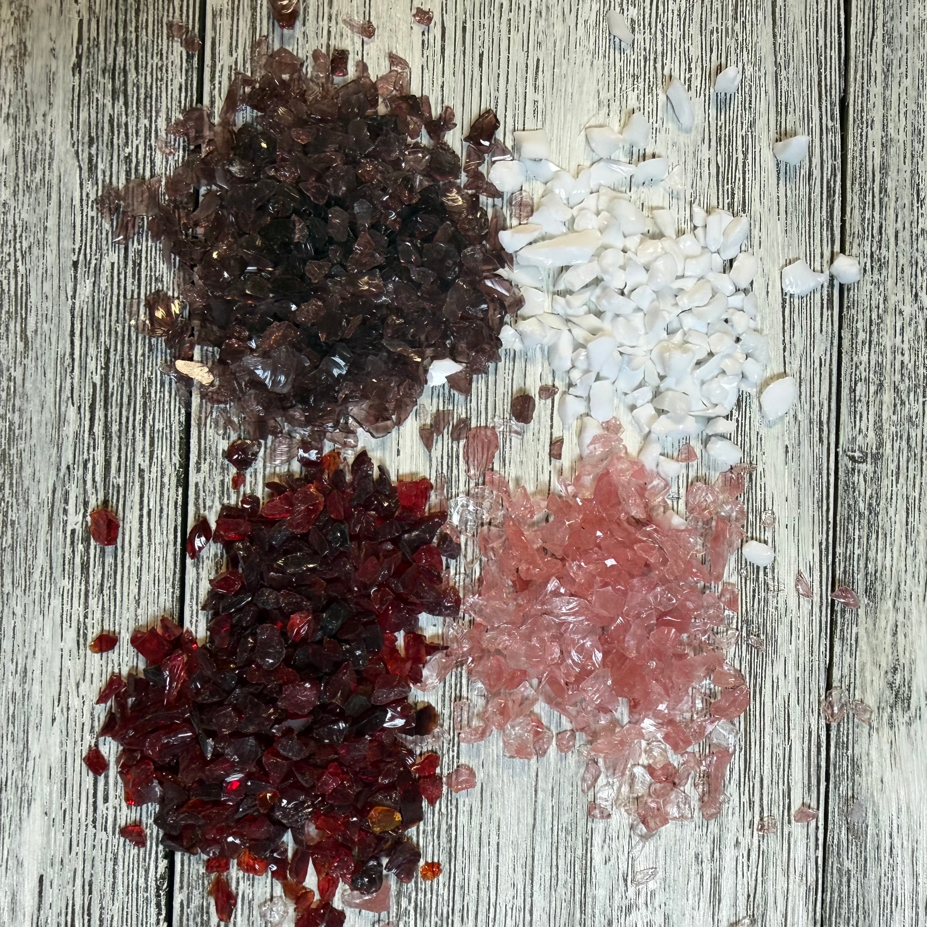 Our most versatile glass size! This glass measures 3-6mm, a perfect size for most projects. Create stunning Valentine and seasonal art with this collection of lobster red, petal pink, white porcelain, and mulberry mist. 3 ounces of each color.