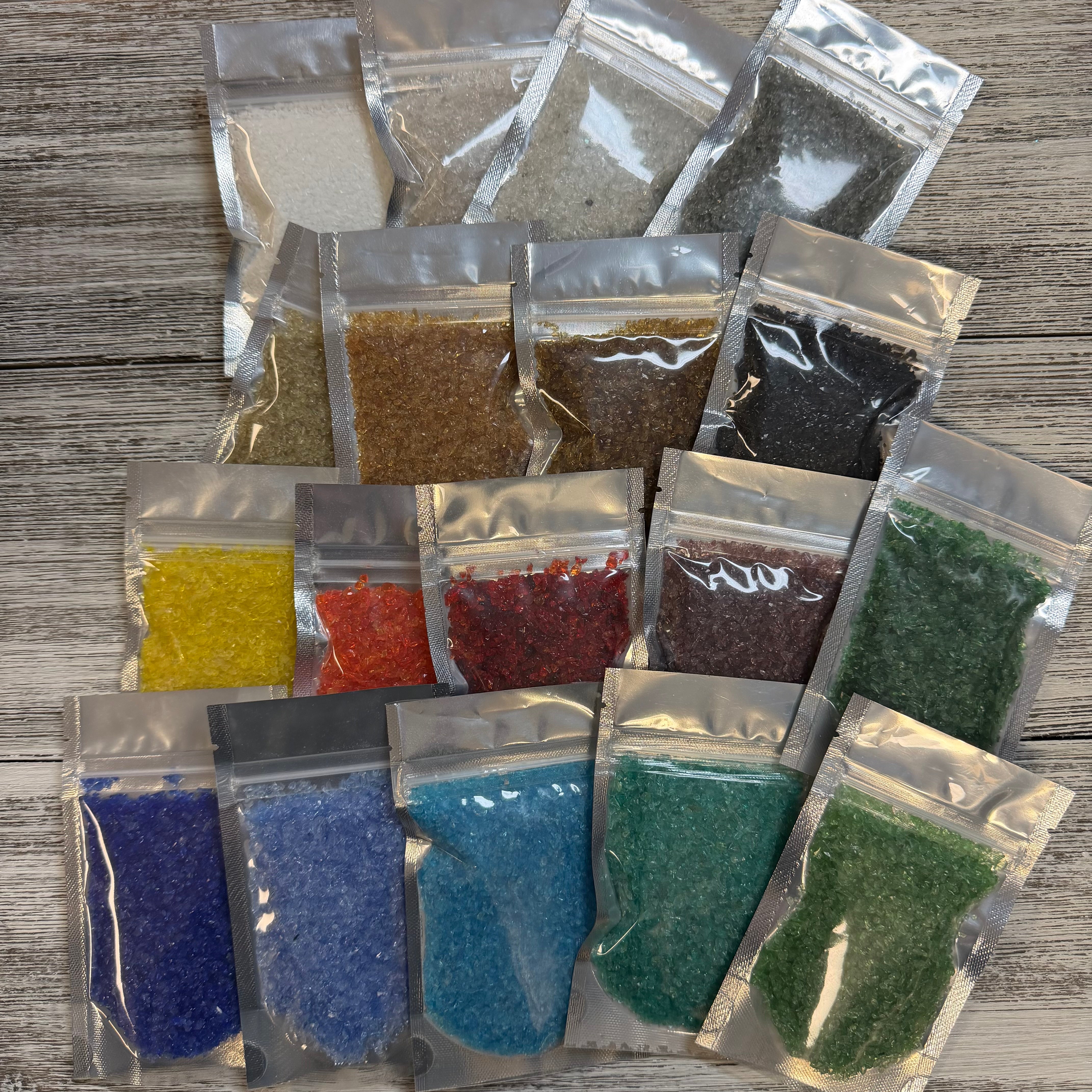 Create stunning stained glass art, as well as beautiful landscapes with our mixed stained glass. Glass measures 1-3mm. You will receive 2 oz of each of our eighteen signature colors!