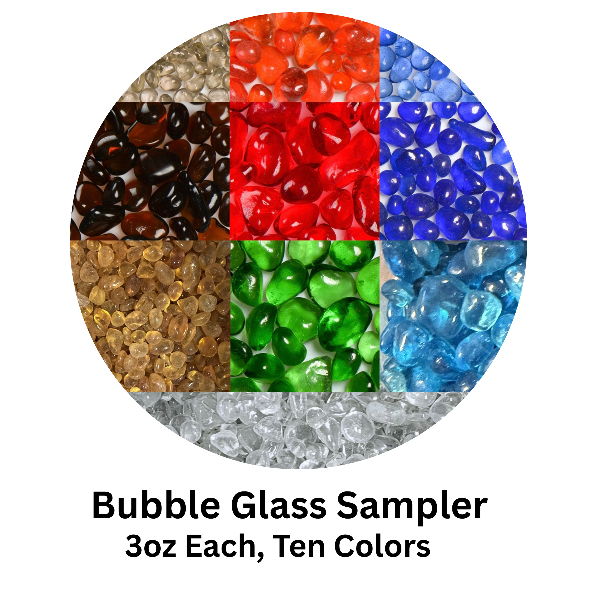 Ten Color Sampler contains 3oz each color. Colored bubble glass is a decorative accent, and is used to add texture, dimension, and visual interest to resin art projects. Its rounded shape creates soft movement in resin, making it ideal for highlighting focal areas and layered designs.