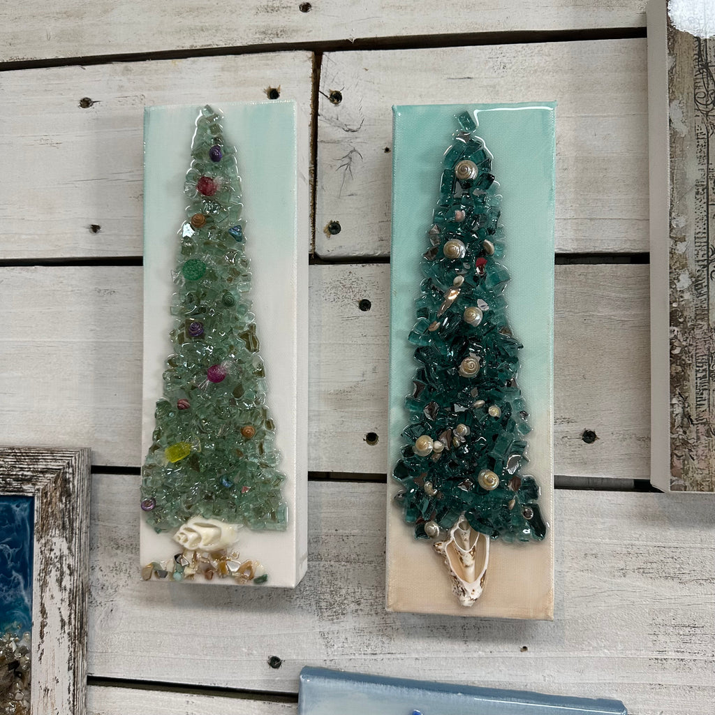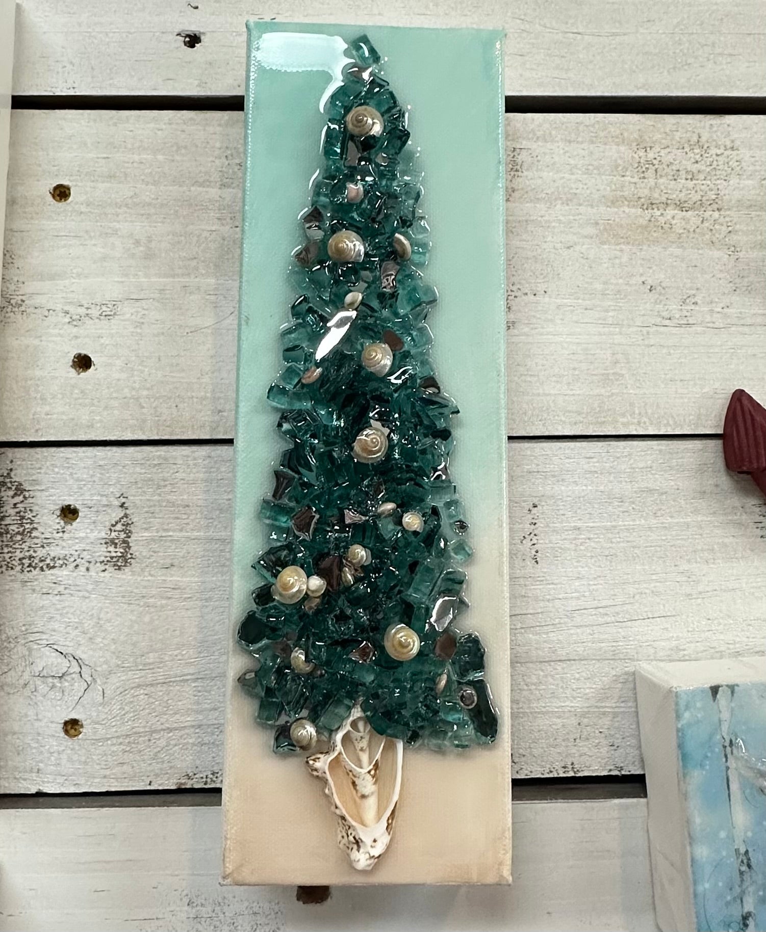 Christmas Tree Glass & Resin Kit with 4x12 white canvas, caribbean blue reflective glass, pearlized Umbonium shell mix, and 2 oz ArtResin. Shell for tree base.