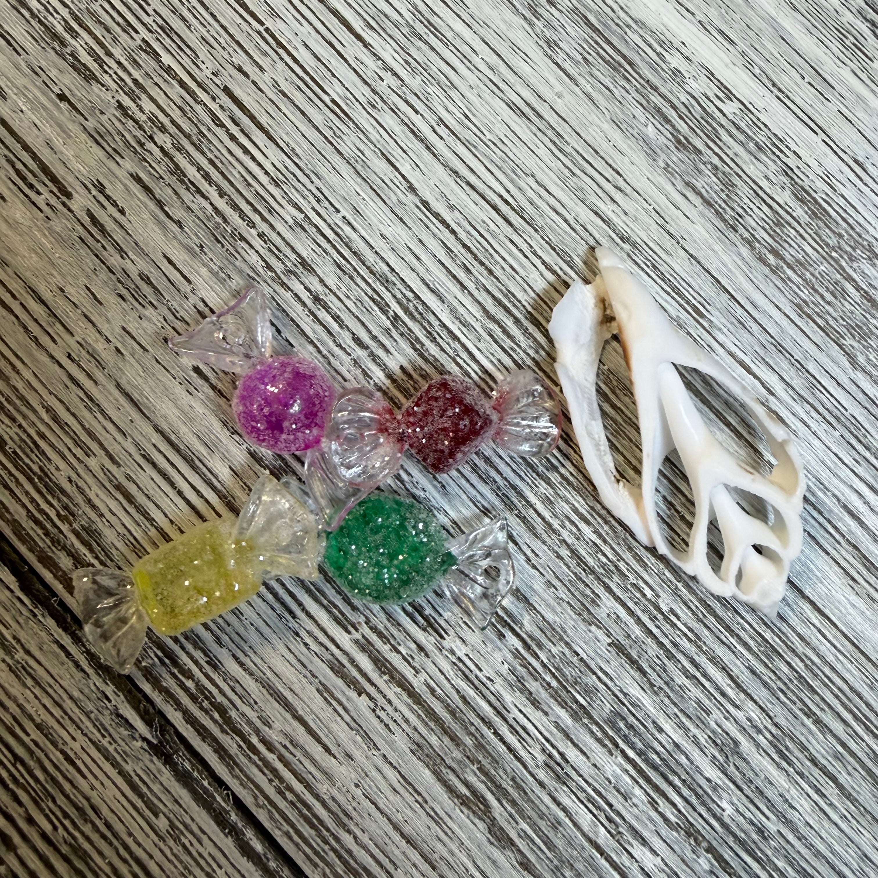 Four sugared candies and a sliced Shell to complete your glass tree. Pair with reflective glass!