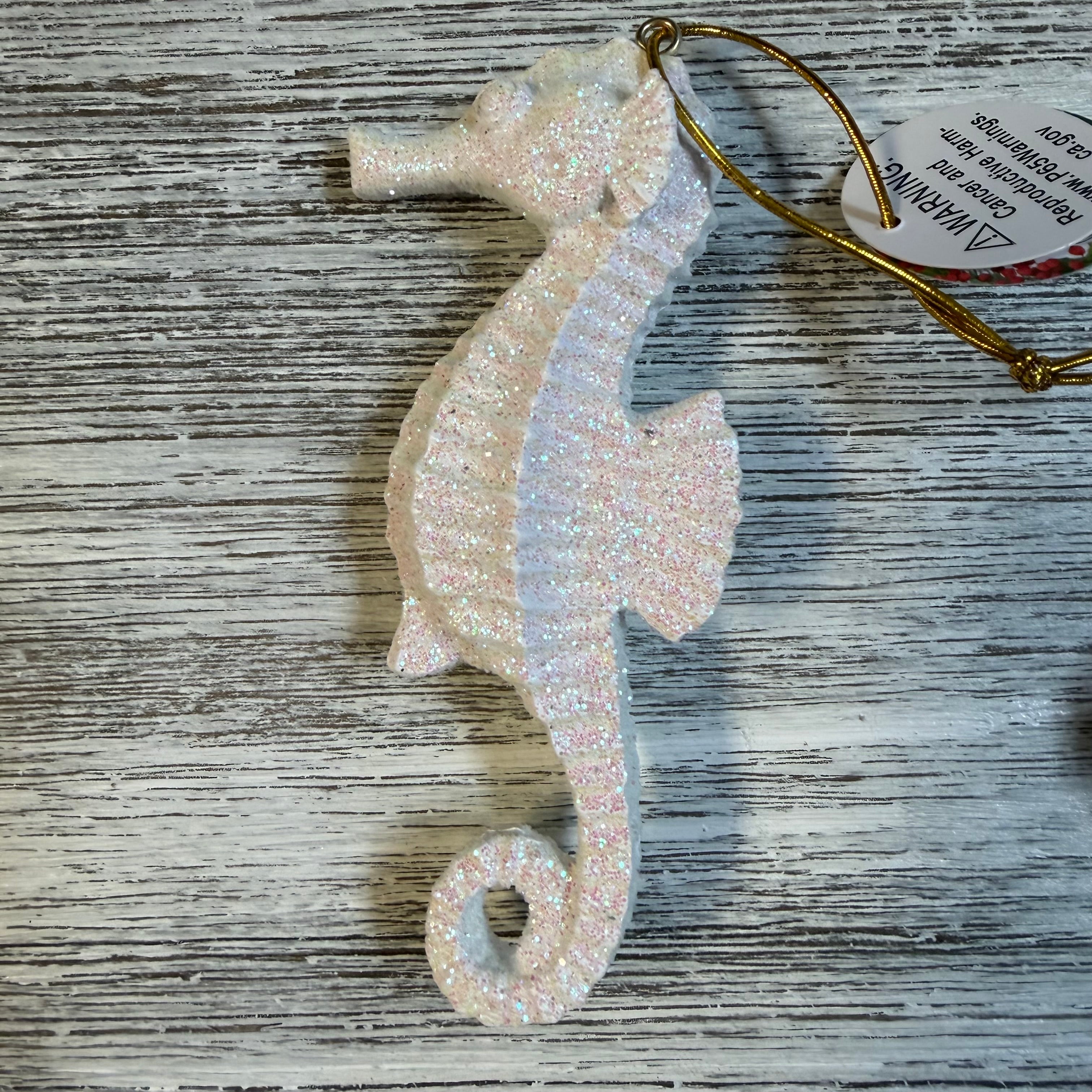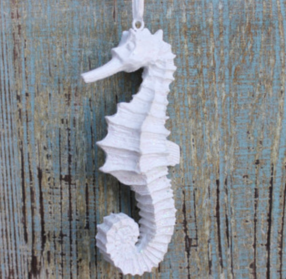 This white glittery seahorse ornament is beautiful in glass and resin art. The seahorse measures 4.25"